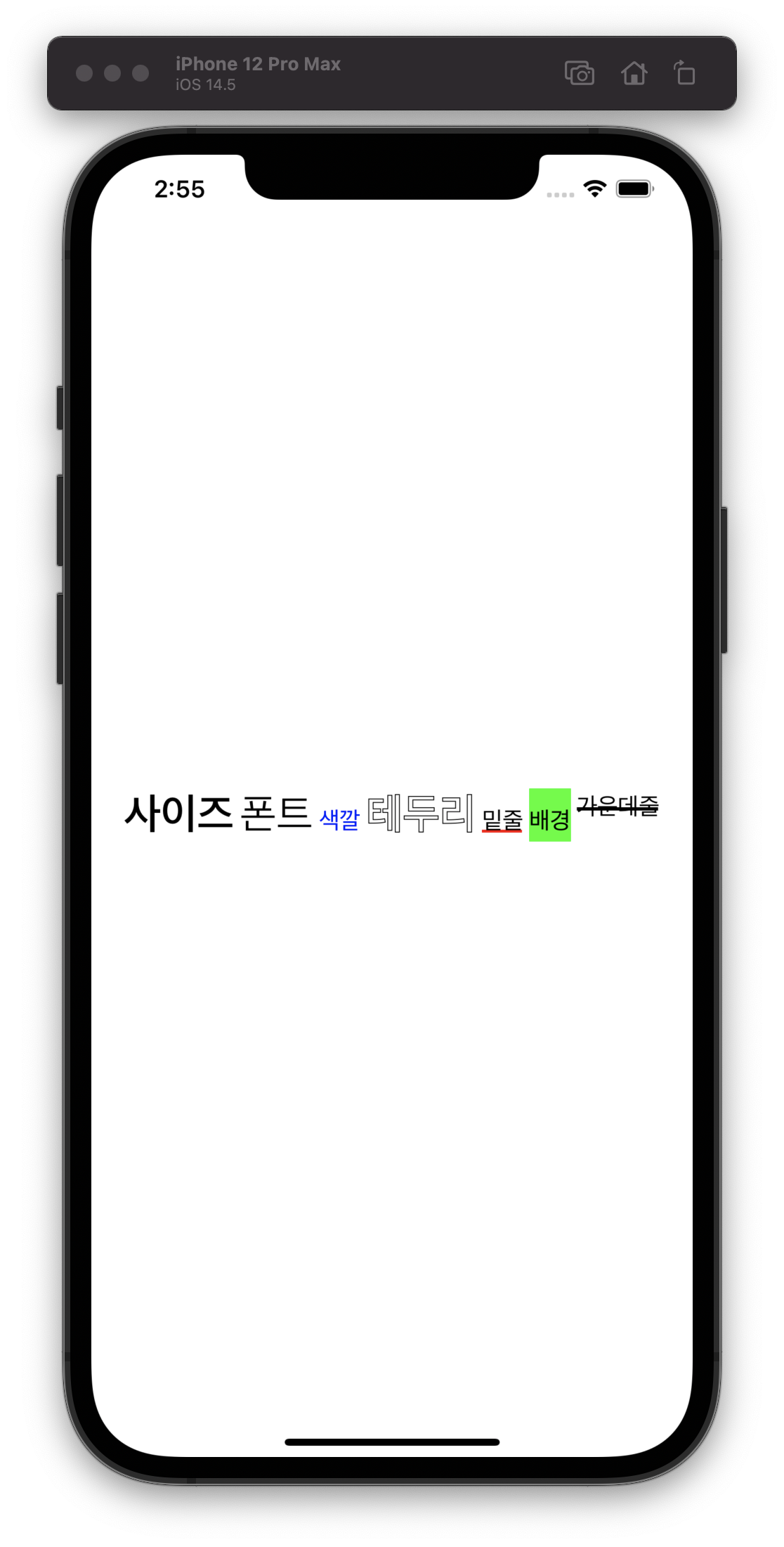 SwiftUI는 이전에는 AttributedString이 따로 없어 Text를 여러 개로 만드는 수밖에 없었어요. 하지만 이번에 AttributedString이 생겨서 훨씬 간단하게 구현할 수 있게 되었습니다. 방법은 위에서 보았던 NSMutableAttributedString과 비슷해요! AttributedString 속성의 Property를 생성해서 조건들을 넣고 이를 Text의 Value로 넣어주면 됩니다!