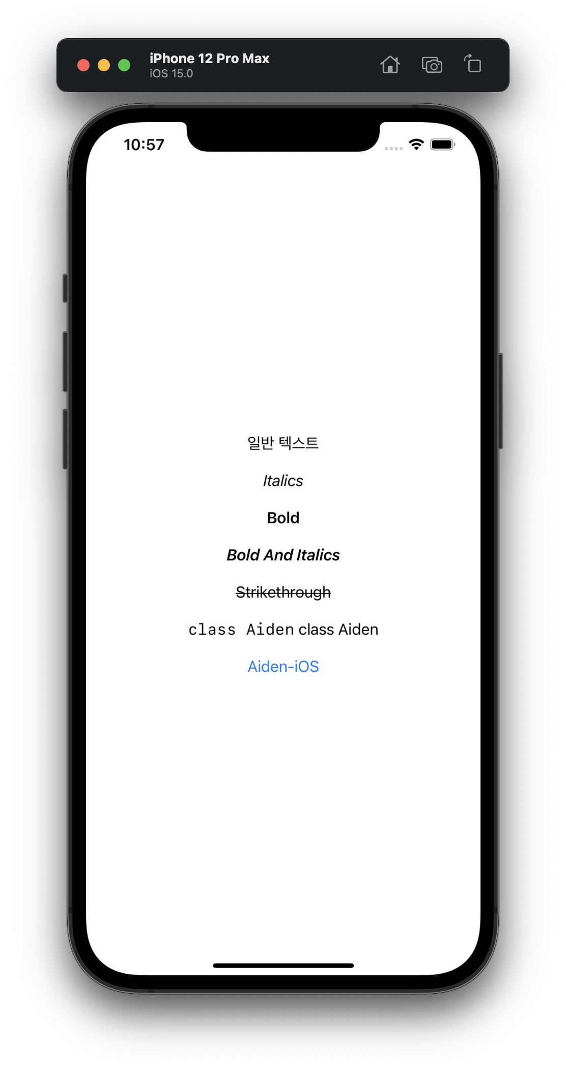 import SwiftUI struct ContentView: View { var body: some View { VStack(alignment: .center, spacing: 20) { Text("일반 텍스트") Text("*Italics*") Text("**Bold**") Text("***Bold And Italics***") Text("~Strikethrough~") Text("`class Aiden` class Aiden") Text("[Aiden-iOS](https://aiden-ios.tistory.com)") } } }