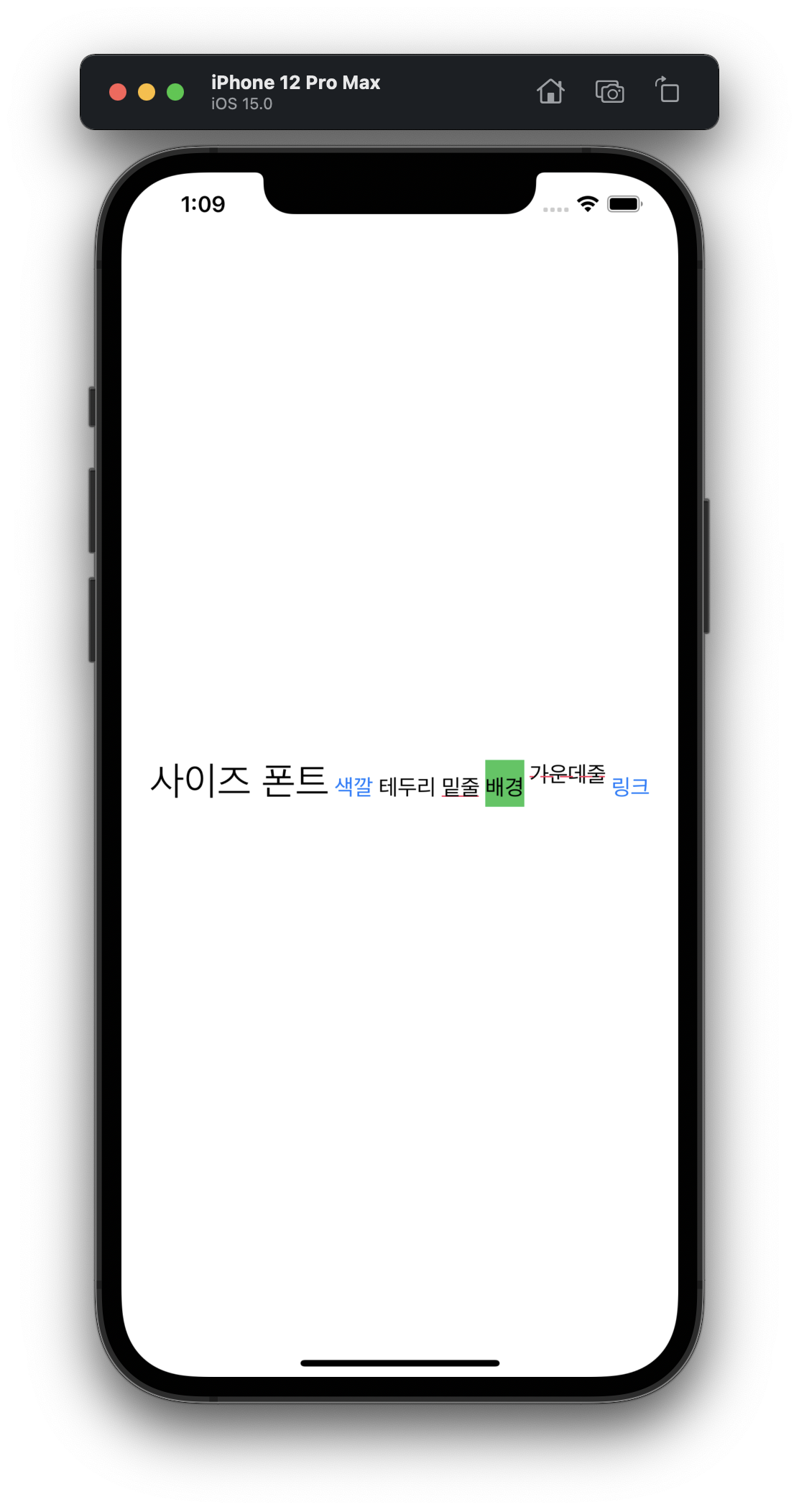 5. dashDotDot (-∙∙-∙∙)import SwiftUI struct ContentView: View { var body: some View { if #available(iOS 15, *) { Text(attributedString) .padding() } else { // Fallback on earlier versions } } } extension ContentView { @available(iOS 15, *) var attributedString: AttributedString { var text: AttributedString = "사이즈 폰트 색깔 테두리 밑줄 배경 가운데줄 링크" let fontRange = text.range(of: "사이즈 폰트")! let colorRange = text.range(of: "색깔")! let strokeRange = text.range(of: "테두리")! let underlineRange = text.range(of: "밑줄")! let backgroundRange = text.range(of: "배경")! let middlelineRange = text.range(of: "가운데줄")! let linkRange = text.range(of: "링크")! // Font text[fontRange].font = UIFont(name:"AppleSDGothicNeo-Light" , size: 30) // Font Color text[colorRange].foregroundColor = .blue // 글자 테두리 text[strokeRange].strokeColor = .red text[strokeRange].strokeWidth = 1 // 밑줄 text[underlineRange].underlineStyle = .init(pattern: .solid, color: .pink) text[backgroundRange].backgroundColor = .green // 가운데 줄 (baselineOffset의 숫자가 커질수록 글자가 위로 올라갑니다.) text[middlelineRange].baselineOffset = 10 text[middlelineRange].strikethroughStyle = .init(pattern: .dash, color: .pink) // 링크 text[linkRange].link = URL(string: "https://aiden-ios.tistory.com") return text } }
