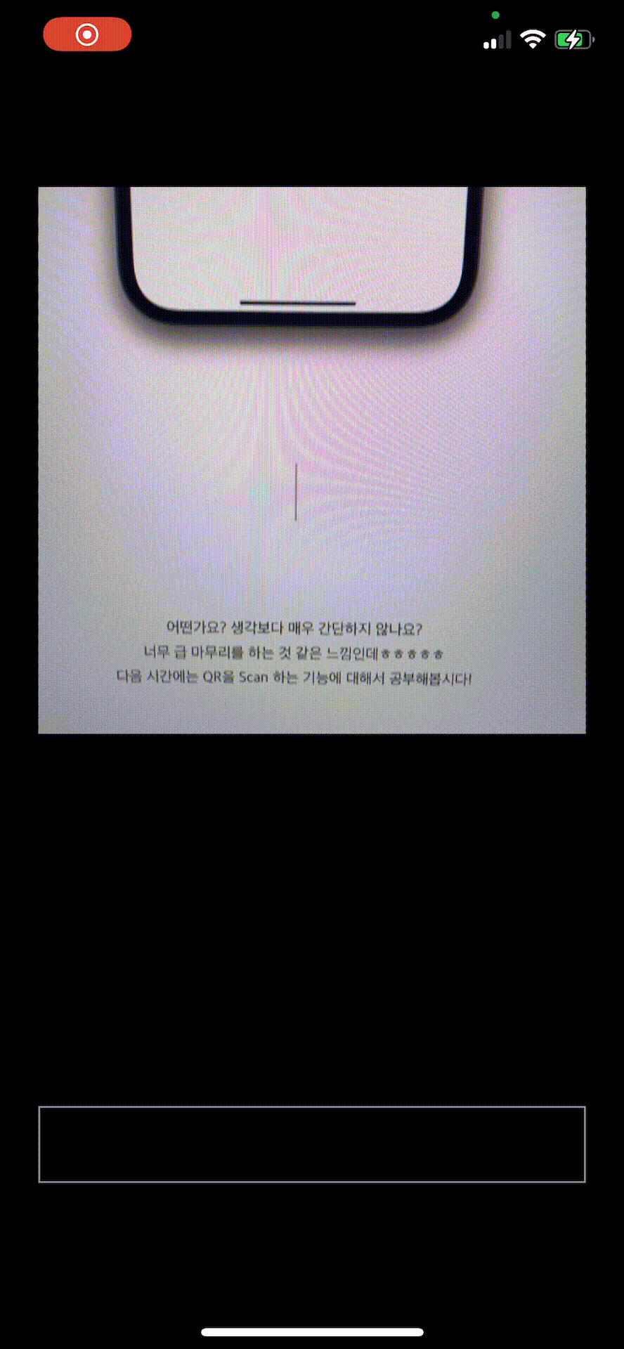 class CustomCameraController: UIViewController, AVCaptureMetadataOutputObjectsDelegate { var image: UIImage? // 실시간 캡처 활동을 관리하고, 입력 장치의 데이터 흐름을 조정하여 출력을 캡처하는 Object var captureSession = AVCaptureSession() // Capture Session에 대한 입력 및 하드웨어별 캡처 기능에 대한 제어를 제공 var backCamera: AVCaptureDevice? var frontCamera: AVCaptureDevice? var currentCamera: AVCaptureDevice? // 캡처된 결과물 var photoOutput: AVCapturePhotoOutput? // Capture Session에서 생성된 메타데이터 var metadataOutput: AVCaptureMetadataOutput? // 캡처된 비디오를 표시하는 Core Animation Layer var cameraPreviewLayer: AVCaptureVideoPreviewLayer? var cardNumber: String = "" // delegate var delegate: AVCapturePhotoCaptureDelegate? func didTapRecord() { let settings = AVCapturePhotoSettings() photoOutput?.capturePhoto(with: settings, delegate: delegate!) } override func viewDidLoad() { super.viewDidLoad() setup() } func setup() { setupCaptureSession() setupDevice() setupInputOutput() setupPreviewLayer() startRunningCaptureSession() } func setupCaptureSession() { // 출력의 품질 설정 captureSession.sessionPreset = AVCaptureSession.Preset.photo } // 디바이스의 어떤 카메라를 사용할지 설정. 여기서는 후면 카메라를 사용합니다. func setupDevice() { let deviceDiscoverySession = AVCaptureDevice.DiscoverySession(deviceTypes: [AVCaptureDevice.DeviceType.builtInWideAngleCamera], mediaType: AVMediaType.video, position: AVCaptureDevice.Position.unspecified) for device in deviceDiscoverySession.devices { switch device.position { case AVCaptureDevice.Position.front: self.frontCamera = device case AVCaptureDevice.Position.back: self.backCamera = device default: break } } self.currentCamera = self.backCamera } func setupInputOutput() { do { let captureDeviceInput = try AVCaptureDeviceInput(device: currentCamera!) captureSession.addInput(captureDeviceInput) photoOutput = AVCapturePhotoOutput() // 출력에 대한 설정 photoOutput?.setPreparedPhotoSettingsArray([AVCapturePhotoSettings(format: [AVVideoCodecKey: AVVideoCodecType.jpeg])], completionHandler: nil) // Capture Session에 Output 추가 captureSession.addOutput(photoOutput!) metadataOutput = AVCaptureMetadataOutput() // output에 메타데이터가 있는지 확인 후 Capture Session에 추가하는 작업입니다. 저희는 단순히 사진을 찍는것이 아닌 QR도 인식해서 값을 받아와야 하기 때문에 메타데이터도 추가해줍니다. if metadataOutput != nil { captureSession.addOutput(metadataOutput!) metadataOutput?.setMetadataObjectsDelegate(self, queue: DispatchQueue.main) // 메타데이터의 타입은 qr이니 qr의 값을 읽어오면 추가하라는 의미입니다. metadataOutput?.metadataObjectTypes = [.qr] } else { return } } catch { print(error) } } // 카메라 화면이 보이는것에 대한 설정 func setupPreviewLayer() { self.cameraPreviewLayer = AVCaptureVideoPreviewLayer(session: captureSession) self.cameraPreviewLayer?.videoGravity = AVLayerVideoGravity.resizeAspectFill self.cameraPreviewLayer?.connection?.videoOrientation = AVCaptureVideoOrientation.portrait self.cameraPreviewLayer?.frame = CGRect(x: 0, y: 0, width: self.view.frame.width - 48, height: self.view.frame.width - 48) self.view.layer.insertSublayer(cameraPreviewLayer!, at: 0) } // Capture Session을 시작! 이 Method를 호출하면 카메라 화면이 나오며 우리가 만든 기능들을 동작시키게 됩니다. func startRunningCaptureSession() { captureSession.startRunning() } // 출력된 이미지를 받아와서 값을 확인 후 값이 있으면 Notification 해줍니다! func metadataOutput(_ output: AVCaptureMetadataOutput, didOutput metadataObjects: [AVMetadataObject], from connection: AVCaptureConnection) { if let metadataObject = metadataObjects.first { guard let readableObject = metadataObject as? AVMetadataMachineReadableCodeObject else { return } guard let stringValue = readableObject.stringValue else { return } if cardNumber != stringValue { cardNumber = stringValue NotificationCenter.default.post(name: NSNotification.Name("Card Number Recognized By QR"), object: stringValue, userInfo: nil) } } } }이렇게 하면 아래와 같이 Scanner가 완성됩니다!