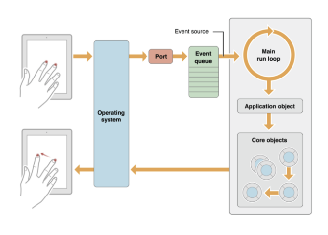 - 아래 그림은 앱의 Main Run Loop의 구조와 사용자 이벤트에 의해 수행되는 단계를 보여주는 그림입니다. (예시는 touch event이고 다른 이벤트들 또한 비슷한 동작 원리로 동작됩니다.)